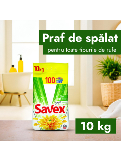Стиральный порошок автомат SAVEX Fresh 10кг благодаря эффективной формуле обеспечивает блестящий результат стирки, роскошь дорогих ароматов, ухаживает за тканью и защищает цвет.
